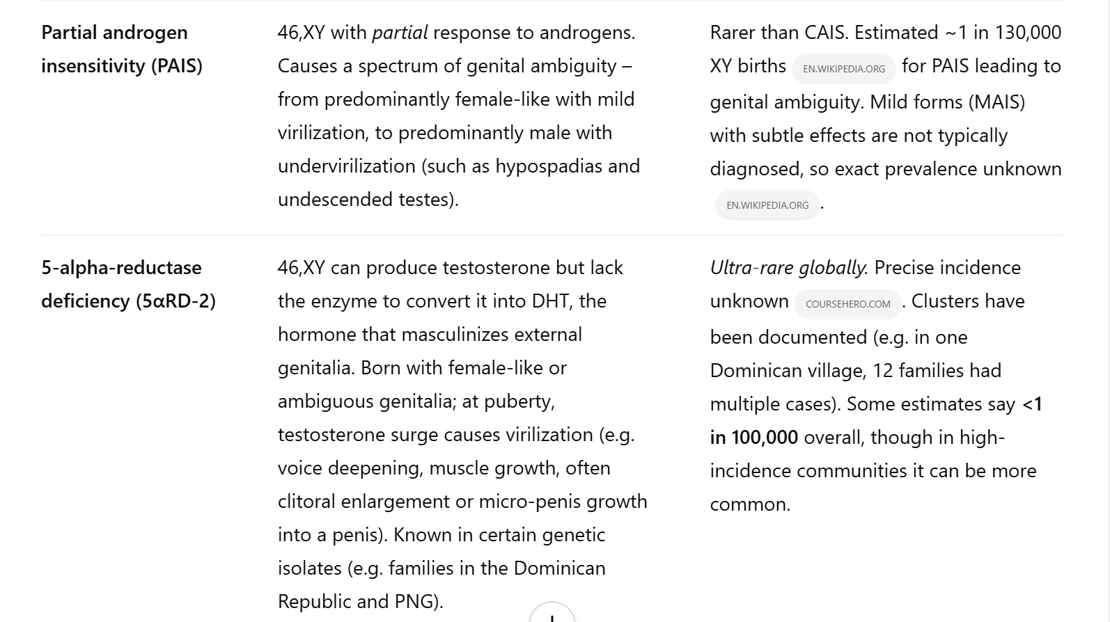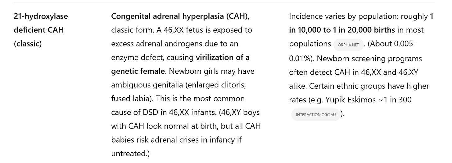 Hormone-related variations that are not included in the medical DSD list can greatly expand prevalence numbers. A prime example is the “non-classical” CAH mentioned earlier. Non-classical CAH is fairly common in certain ethnic groups (e.g. as many as ~3.7% of Ashkenazi Jews carry it) ( Population figures – InterAction), and on the order of 1 in 200 to 1 in 1,000 in many populations – which is orders of magnitude more frequent than classic CAH at birth. Fausto-Sterling’s analysis assumed roughly 1.5% of people have some form of late-onset adrenal hyperplasia (How common is intersex? | Intersex Society of North America), thus contributing the bulk of the 1.7%. Most endocrinologists would not classify those individuals as “disorders of sex development” because they typically have normal genital anatomy corresponding to their chromosomes (the effects are more metabolic or post-puberty). But under a broader “sex variance” lens, they do count, since their sex hormone profile is atypical and it can affect secondary sex characteristics.