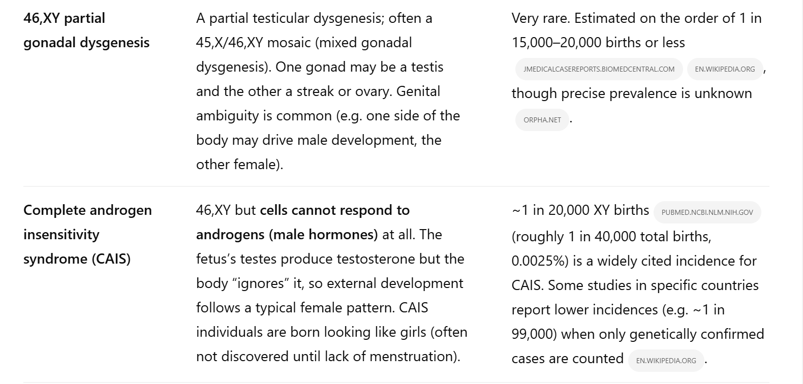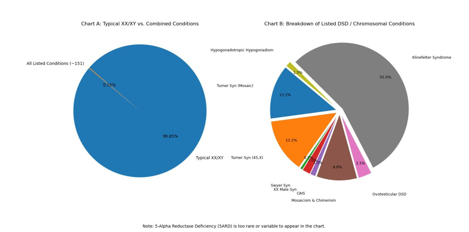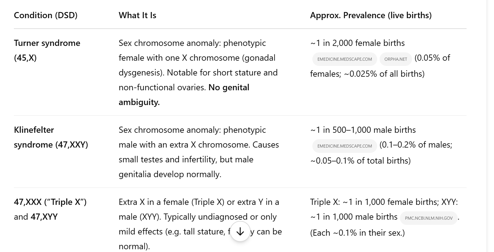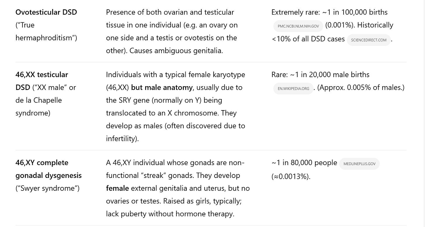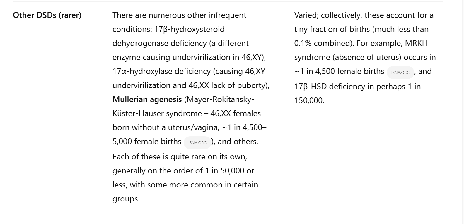 Clinicians today often use the term Disorders of Sex Development (DSDs) to describe congenital conditions involving atypical development of chromosomal, gonadal, or anatomical sex ( Consensus statement on management of intersex disorders - PMC ). (Many advocate the term “Differences of Sex Development” as a less stigmatizing alternative, but the abbreviation DSD is the same.) These diagnoses are typically made when an infant is born with ambiguous genitalia, or when puberty and fertility patterns reveal an underlying sex-development variation. Below is a breakdown of major DSD conditions and best-estimate frequencies from medical literature: