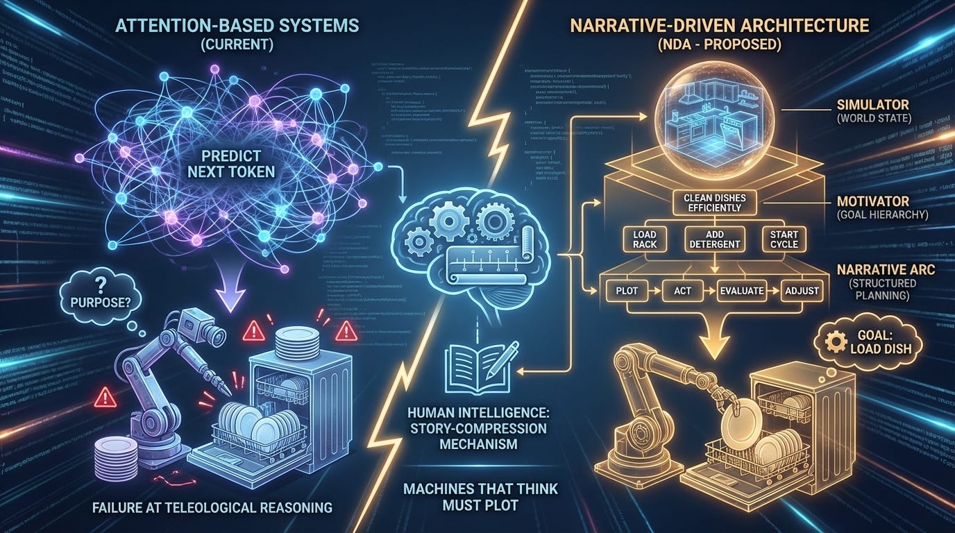 Current large language models, despite their remarkable capabilities, exhibit a fundamental architectural limitation: they predict sequences without understanding purpose. This paper argues that the missing component in artificial general intelligence is not larger context windows or more parameters, but rather a narrative architecture—a system that constrains action sequences through goals and world models. We propose a three-layer Narrative-Driven Architecture (NDA) consisting of a Simulator (world state), a Motivator (goal hierarchy), and a Narrative Arc (structured planning). Through the lens of a simple dishwasher-loading task, we demonstrate how attention-based systems fail at precisely the moments when teleological reasoning becomes necessary. We further argue that this narrative framework offers significant advantages for AI safety and alignment: by making goals explicit and endings auditable, we create systems whose intentions can be understood, evaluated, and constrained. We conclude that human intelligence is fundamentally a story-compression mechanism, and that building machines that think may require building machines that plot.